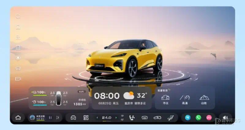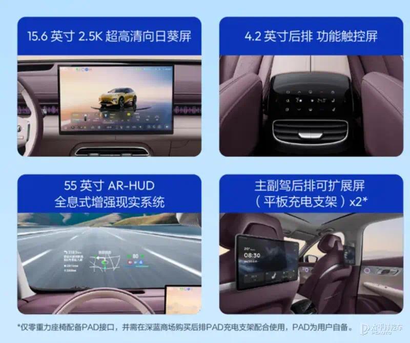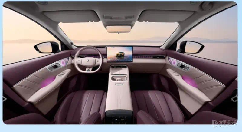 车内延续环抱式中控台设计,贯穿式的空调出风口搭配双辐式多功能方向盘、55英寸AR-HUD、15.6英寸悬浮式向日葵屏(内置高通骁龙8295P芯片)以及20枚扬声器(杜比全景声),同时提供三款内饰配色。同时,其中控屏下方T字区域加入手机无线充电、双杯架等,提升日常用车便利性。