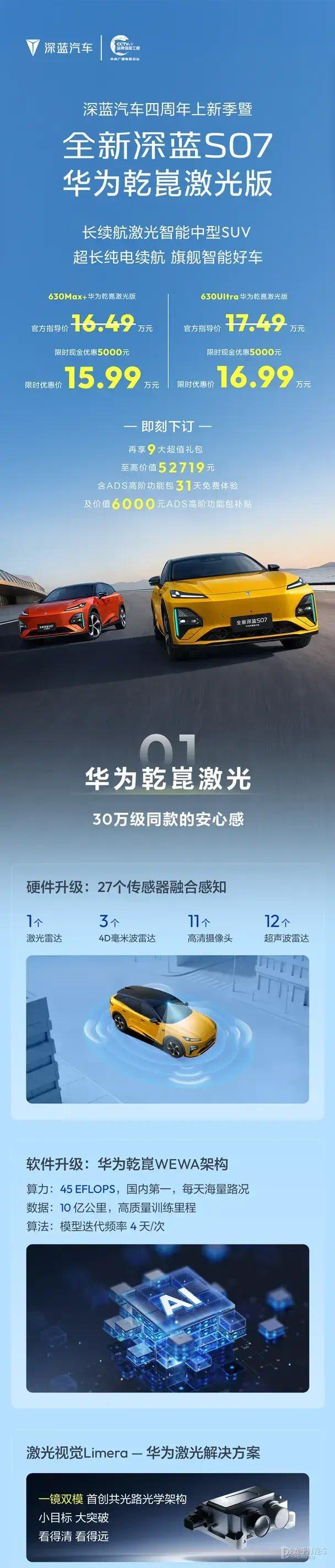 【太平洋汽车 汽车动态】近日,全新深蓝S07华为乾崑激光版在广州区域市场正式上市。新车定位长续航激光智能中型SUV,聚焦15-20万级家用新能源汽车市场,依托华为智驾技术与深蓝整车制造能力,推出两款配置车型,限时优惠后售价15.99万元起,同步推出多项购车支持政策。