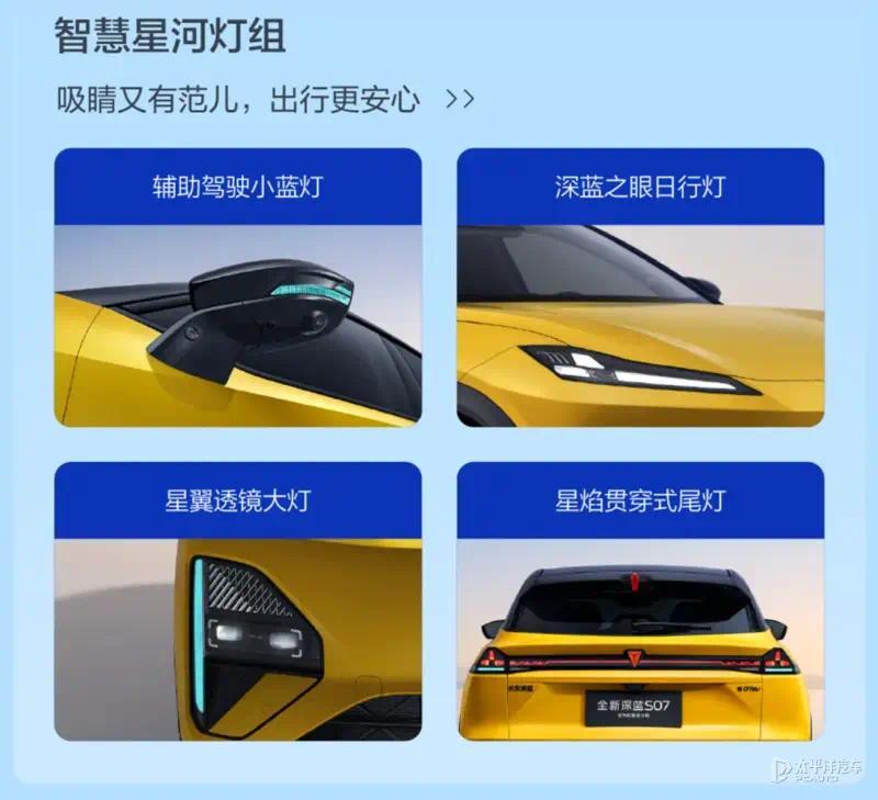在设计方面,深蓝S07华为乾崑激光版继续延续了现有的家族式设计风格,拥有标示性细长的大灯组提,下方则依旧保留了大尺寸通风口的设计。配色方面,该车将提供驰光黄、炽云橙、星耀黑、冷星白、月岩灰。