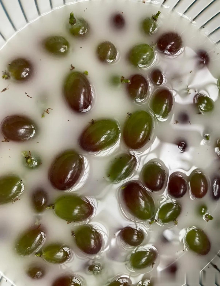 葡萄表面总是有一层白霜,用水根本冲不掉,使劲搓又怕把葡萄搓烂了。其实,咱们厨房里的普通面粉就是最好的清洁剂。把葡萄一颗颗剪下来放进盆里,倒上适量清水,再舀一勺普通面粉搅匀。面粉水有很强的吸附性,能轻松带走葡萄表皮褶皱里的脏东西和农药残留。泡个三五分钟,再用清水一冲,葡萄立马晶莹剔透,干净得很。